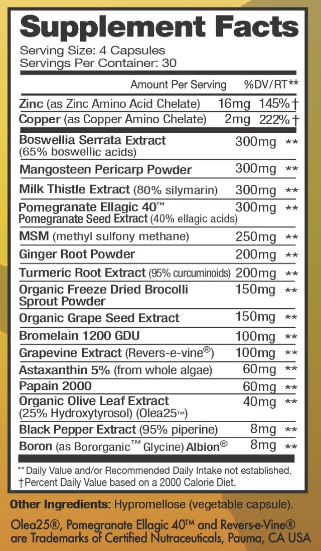 This formula emphasizes inflammatory and recovery load support. Ingredients are selected to support antioxidant buffering, recovery capacity, and absorption processes.